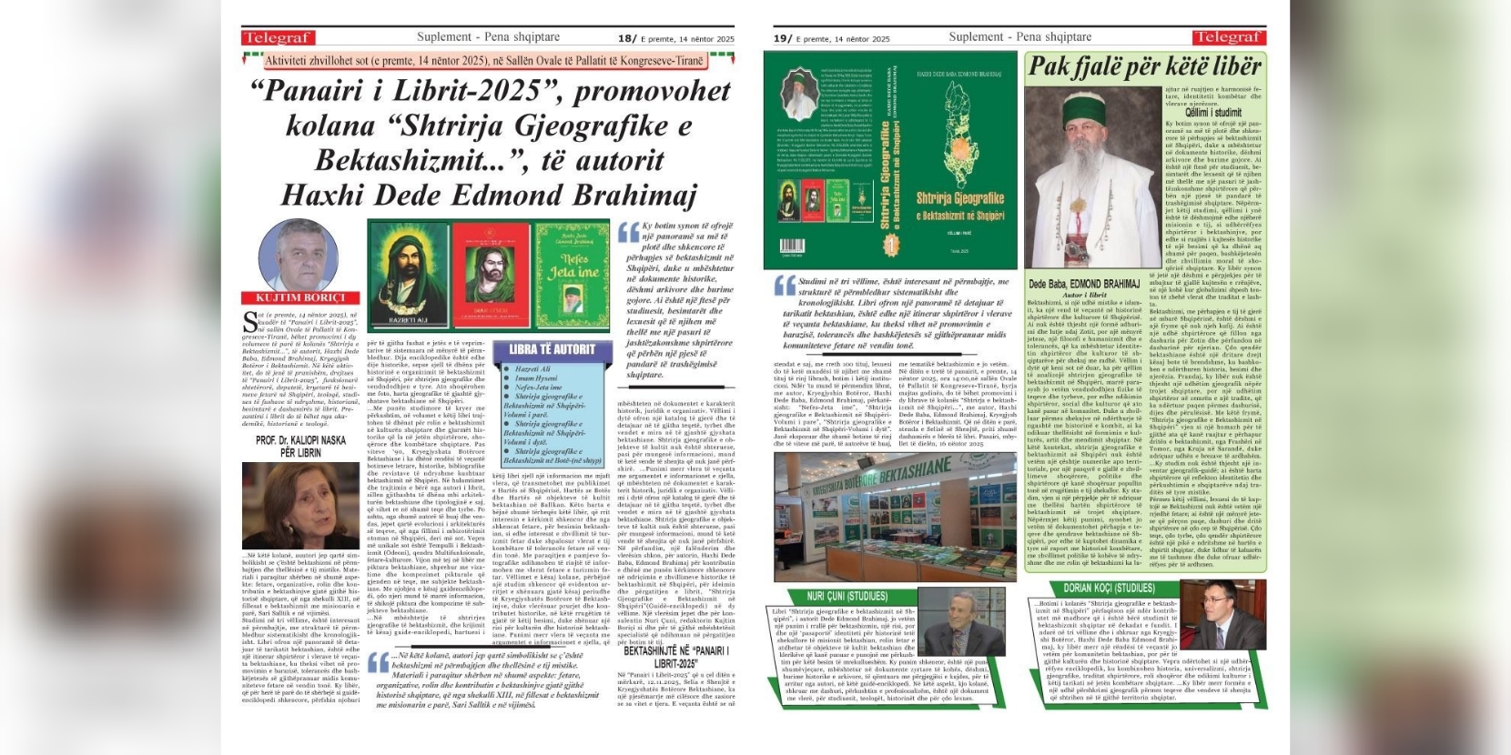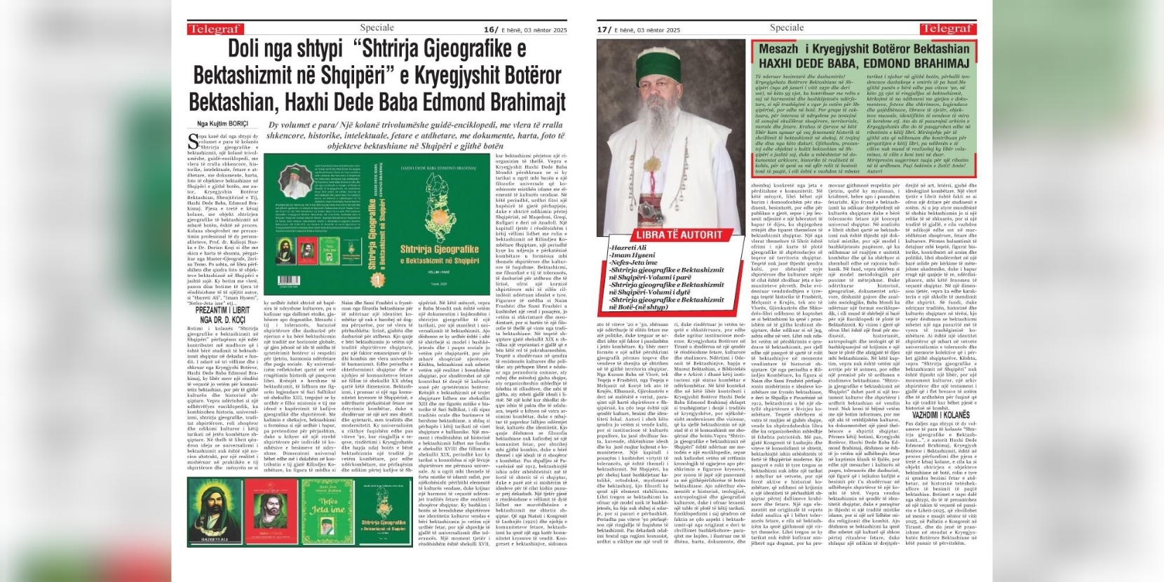 3 Nëntor, 20254 Nëntor, 2025KRYESORE, LAJME DOLËN NGA SHTYPI DY VOLUMET E PARA TË KOLANËS “SHTRIRJA GJEOGRAFIKE E BEKTASHIZMIT…”, E KRYEGJYSHIT BOTËROR BEKTASHIAN, HAXHI DEDE EDMOND BRAHIMAJT (Botuar në gazetën ‘Telegraf’, 03.11.2025) Nga Kujtim BORIÇI Dy volumet e para/ Një kolanë trivolumëshe guidë-enciklopedi, me vlera të rralla shkencore, historike, intelektuale, fetare e atdhetare, …