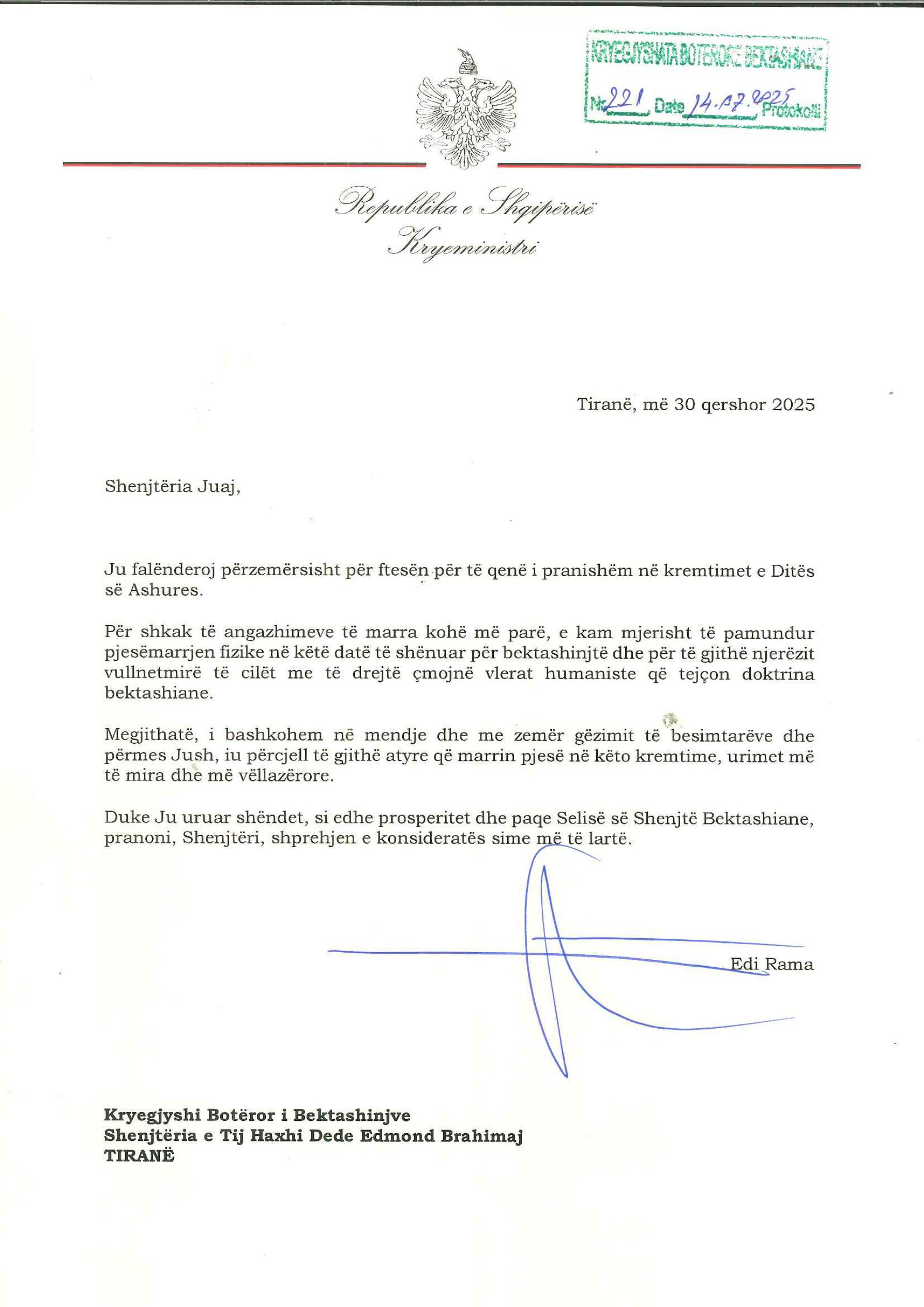 Me rastin e kremtimit të Ditës së Ashures, Kryeministri i Shqipërisë, z. Edi Rama, ka dërguar një mesazh urimi dhe mirënjohjeje për besimtarët bektashinj dhe për Selinë e Shenjtë Bektashiane. Në letrën drejtuar Kryegjyshit Botëror Bektashian, ai shpreh vlerësimin për vullnetin dhe përkushtimin e komunitetit bektashian në promovimin e vlerave humaniste dhe vëllazërore që përçon kjo doktrinë. Edhe pse i pamundur të marrë pjesë fizikisht, Kryeministri bashkohet në mendje dhe zemër me besimtarët në këtë ditë të shënuar shpirtërore.