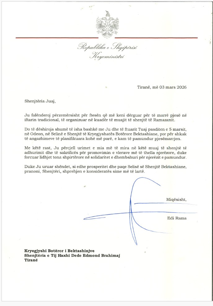 Në pamundësi për të qenë fizikisht në Iftarin e shtruar të enjten më 6 mars 2027 nga Kryegjyshata Botërore Bektashiane, Kryeministri i Republikës së Shqipërizë, Z. Edi Rama, i ka dërguar një mesazh urimi Kryegjyshit, Dede Baba, Edmond Brahimaj, ku i konfirmon: “… Shenjtëria Juaj! Ju falënderoj përzemërsisht për ftesën që më keni dërguar për të marrë pjesë në iftarin tradicional, të organizuar në kuadër të muajit të shenjtë të Ramazanit.