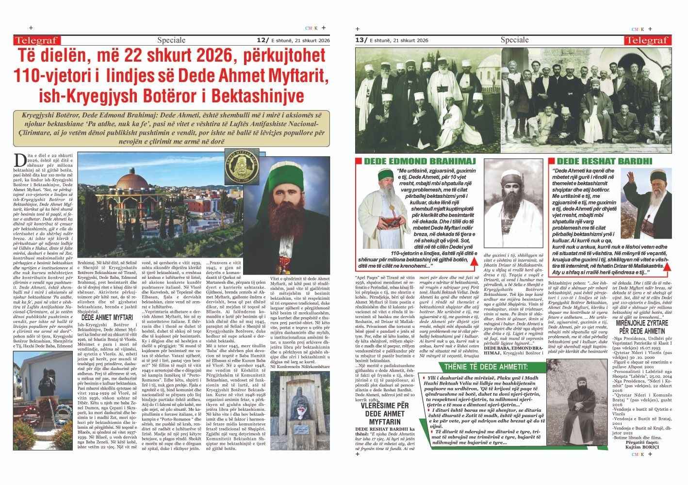 Dita e diel e 22 shkurti 2026, është një ditë e shënuar për miliona bektashinj në të gjithë botën, pasi është dita kur 110 mite më parë, ka lindur ish-Kryegjyshi Botëror i Bektashinjve, Dede Ahmet Myftari. “Sot, ne përkujtojmë 110-vjetorin e lindjes së ish-Kryegjyshit Botëror të Bektashinjve, Dede Ahmet Myftarit, klerikut që ka bërë shumë për besimin tonë të paqtë, si fetar e atdhetar. Dede Ahmeti ka dhënë një kontribut të çmuar për bektashizmin, gjë e cila do vlerësohet e do shërbej ndër breza. Ai ishte një klerik i përkushtuar që ndjente lodhje në Udhën e Hakut, dinte të falte mirësi, dashuri e besim në Zot, kontribuoi maksimalisht për përhapjen e besimit bektashian dhe ngritjen e institucioneve si dhe nuk kurseu mbështetjen dhe kontributin konkret për çlirimin e vendit nga pushtuesit. Dede Ahmeti, është shembulli më i mirë i aksiomës së njohur bektashiane ‘Pa atdhe, nuk ka fe’, pasi në vitet e vështira të Luftës Antifashiste Nacional-Çlirimtare, ai jo vetëm dënoi publikisht pushtimin e vendit, por ishte në ballë të lëvizjes popullore për nevojën e çlirimit me armë në dorë”- pohon ndër të tjera, Kryegjyshi Botëror Bektashian, Shenjtëria e Tij, Haxhi Dede Baba, Edmond Brahimaj.
